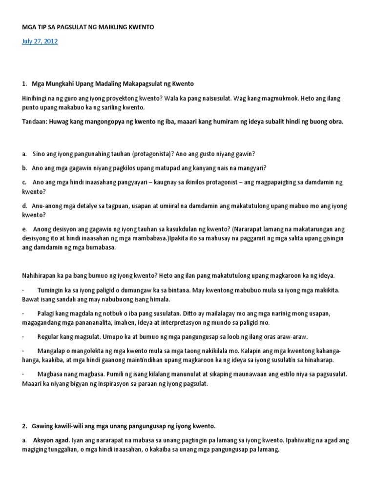Mga Tip Sa Pagsulat Ng Maikling Kwento Pdf