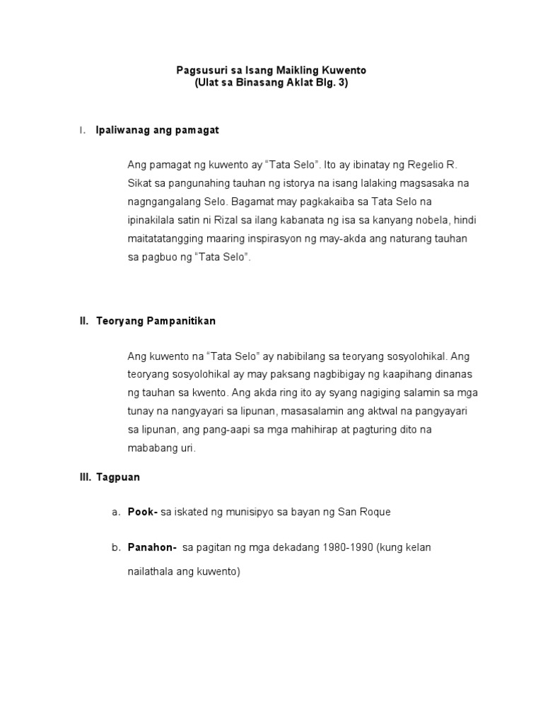 Pagsusuri Sa Isang Maikling Kuwento Ulat Sa Pdf