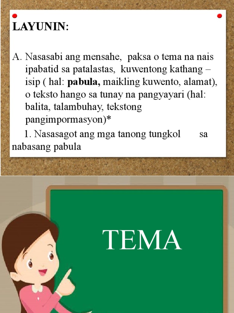 Halimbawa ng paksa o tema sa kwento. Si Peter ay ang pangulo ng aming silid-aralan. -Ang kabuuan nito ay mapapatibay sa temamensahe ng maikling. KAIBAHAN NG PAKSA AT LAYON Sa paksang ito ating tatalakayin kung ano nga ba ang pinagkaiba ng paksa at layon.