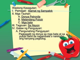 Mahusay si Nina sa filipino at math kaya siya ang laging inilalaban sa mga math contest at mga pahayag sa filipino. Leni mailani891 Jumat 25. Maaaring hango ito sa mga pangyayari sa totoong buhay at maari ding itoy patungkol sa kababalaghan at mga bagay na.